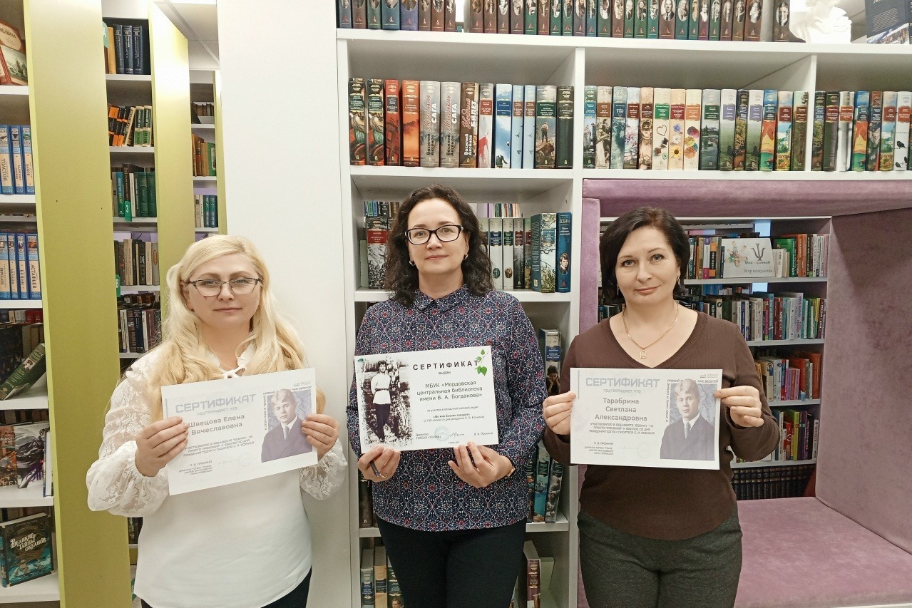 Библиотекарь Светлана Тарабрина, методист Елена Швецова и библиотекарь сектора комплектования и обработки литературы Елена Швецова получили сертификаты за участие в веб-квесте «Есенин — не просто прохожий», посвящённом 130-летию со дня рождения поэта. Также за участие в региональной сетевой акции «Во мне Есенин говорит» сертификаты вручили Мордовской центральной библиотеке имени В. А. Богданова, детской библиотеке, Большелавровской, Кужновской, Ивановской, Лавровской, Ленинской, Плоскинской, Степновской и Шульгинской библиотекам-филиалам.
