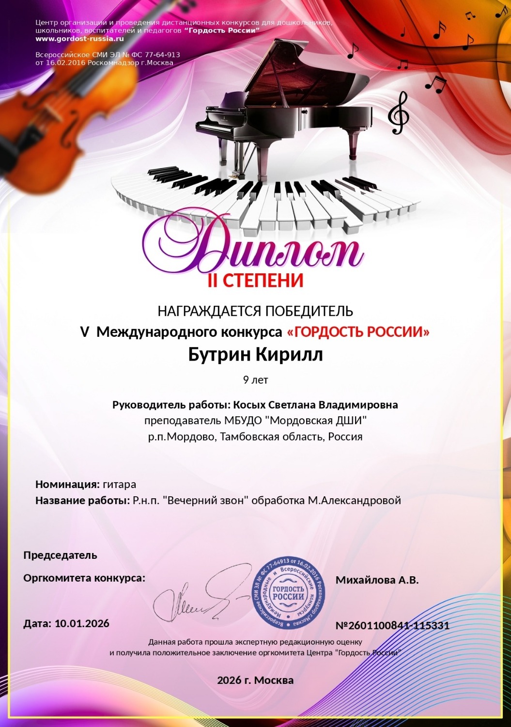 В январе 2026 года вокальный ансамбль «Звонкий камертон» Мордовской детской школы искусств в дистанционном формате принял участие в V Международном конкурсе «Гордость России», который проходил в Москве.