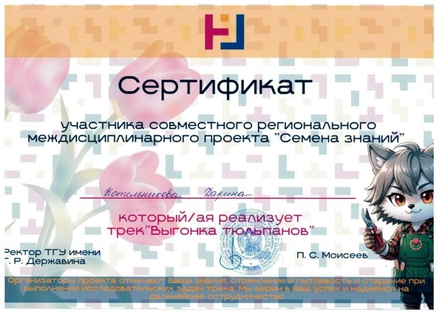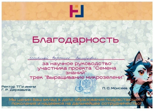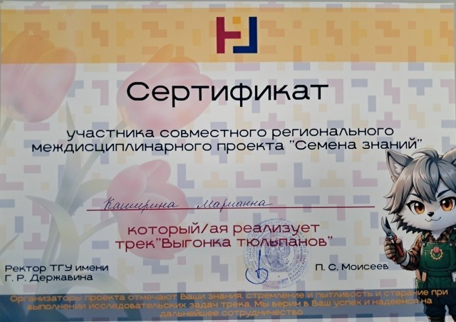 Девятиклассницам Марианне Кашириной, Анне Левиной и Дарине Котельниковой вручены сертификаты участия в региональном междисциплинарном проекте «Семена знаний». Педагогу Веронике Шибиной объявлена благодарность за научное руководство участников проекта. Защита по итогам проекта состоится в конце учебного года. А пока юным экспериментаторам предстоит следующий этап – выращивание рассады, которую они потом высадят на пришкольном участке.