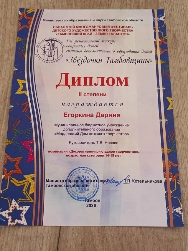 Воспитанница Мордовского Дома детского творчества Дарина Егоркина стала серебряным призёром конкурса в номинации «Декоративно‑прикладное творчество» в возрастной категории 14-18 лет.