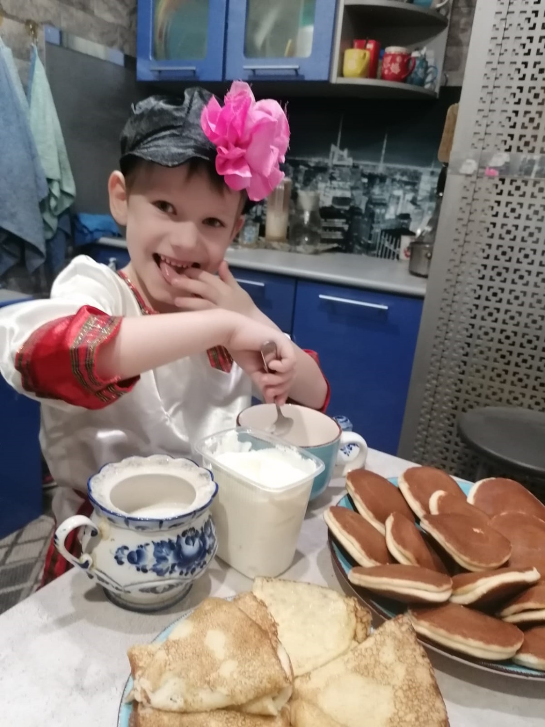 Семья Ведищевых из посёлка Мордово очень обрадовалась такому заданию, ведь блины — это любимое семейное блюдо, и пекут они их не только на Масленицу. Сергей, Татьяна, четвероклассник Максим и шестилетний Кирилл дружно взялись за дело, и вскоре стопка ароматных блинов манила попробовать их с чаем, вареньем и сметаной.