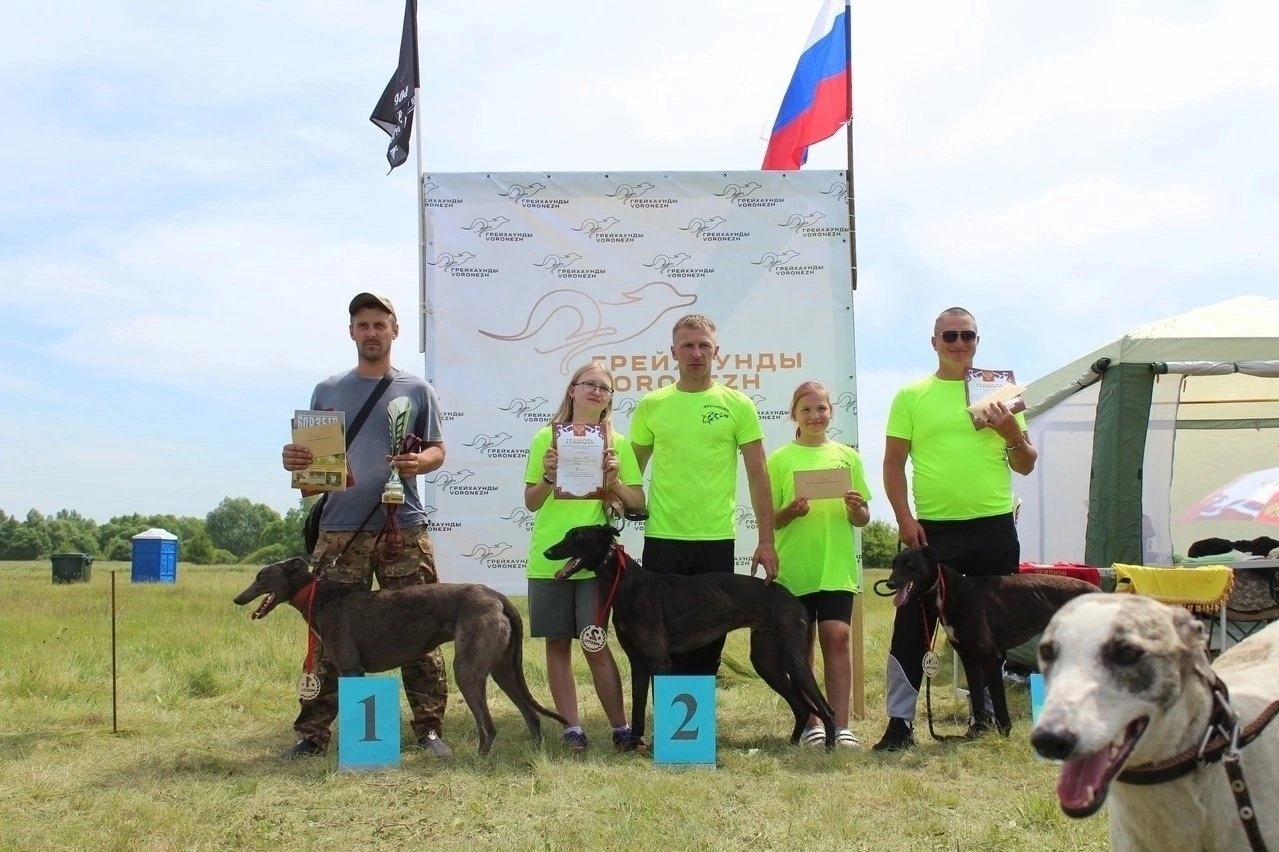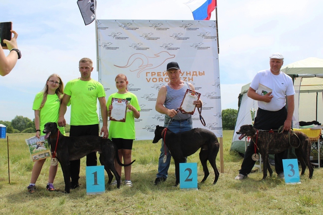 Вторые места достались грейхаундам по кличке Атаман, Персей, Седрик — хозяин Александр Косых.