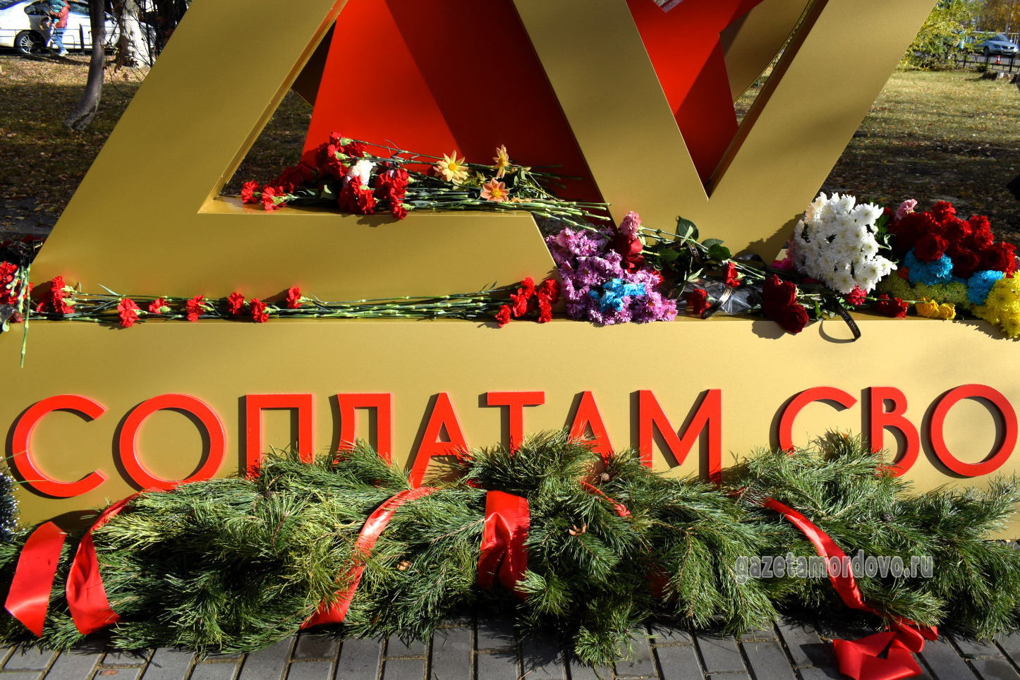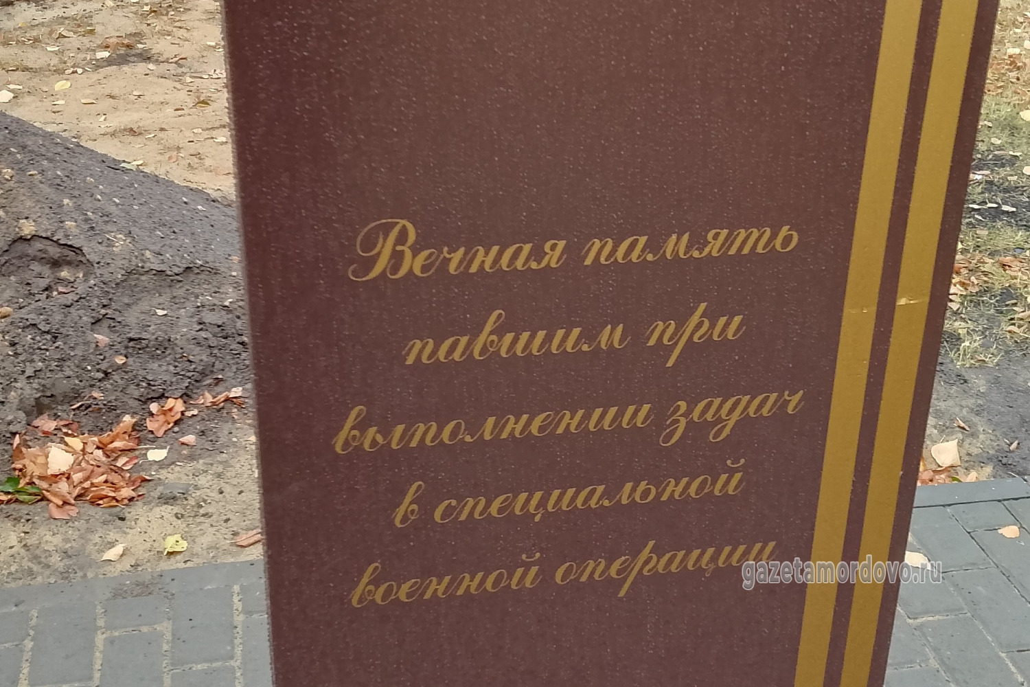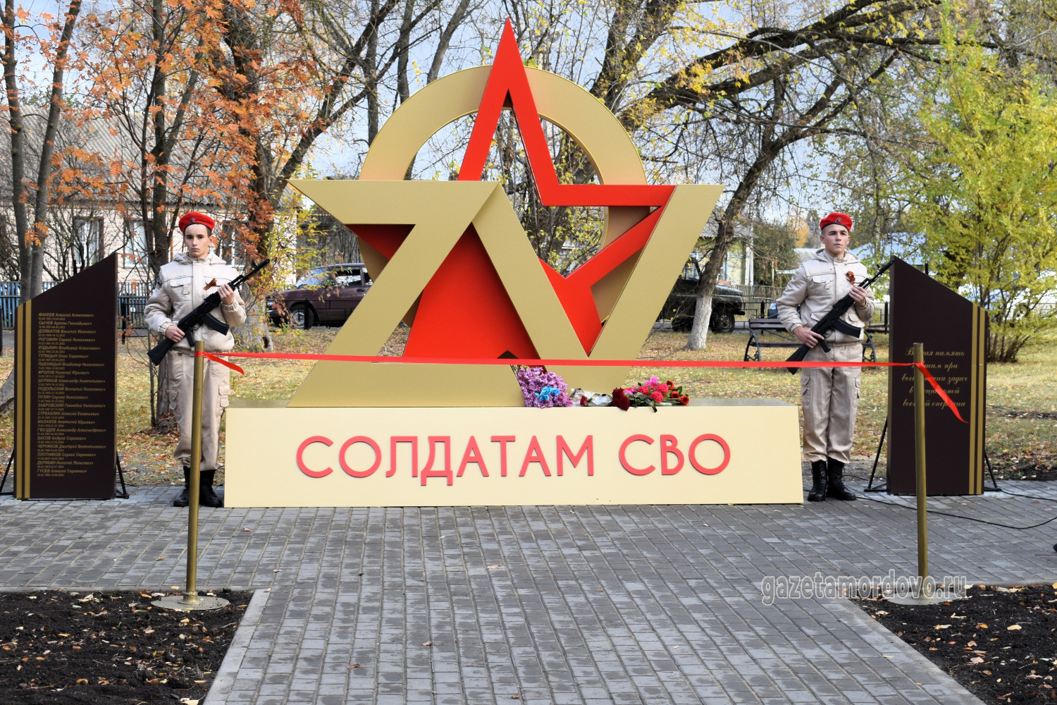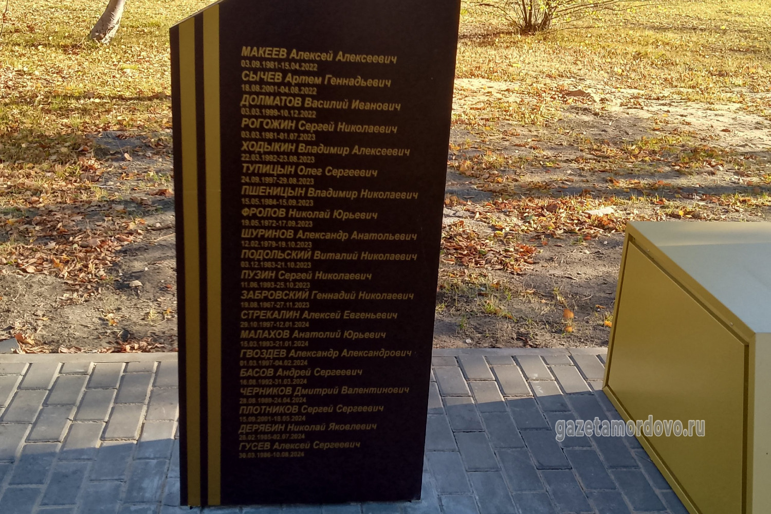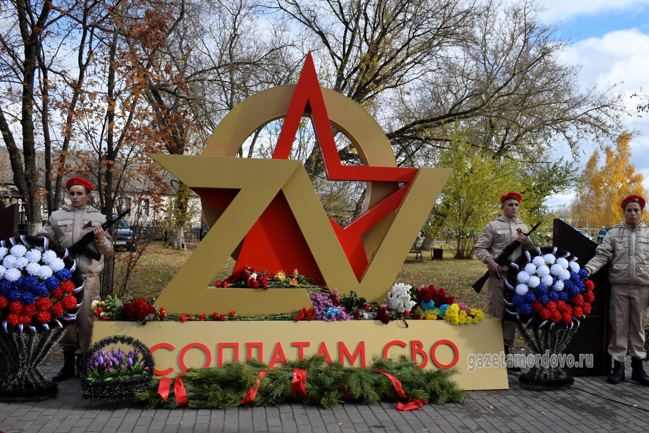С правой стороны от арт-объекта разместили стелу с надписью: «Вечная память павшим при выполнении задач в специальной военной операции», с левой — стелу с именами 20 уроженцев Мордовского округа, которые погибли в ходе специальной военной операции.