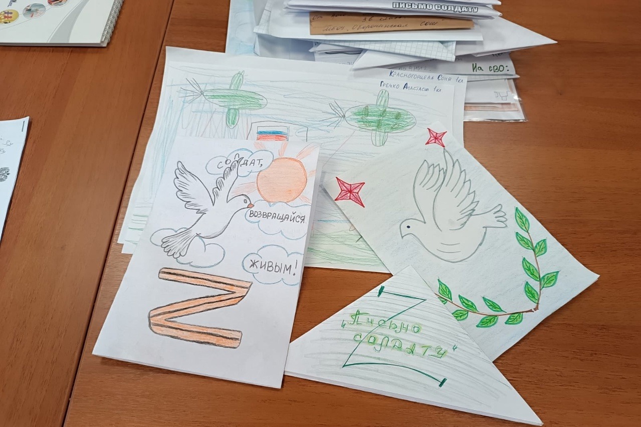 Свои письма ребята украсили рисунками, цветами российского триколора, георгиевскими ленточками, лавровыми ветками. В них они выразили слова поддержки и благодарности бойцам за мирное небо. Большинство писем оформлено по традиции — в виде военных треугольников.