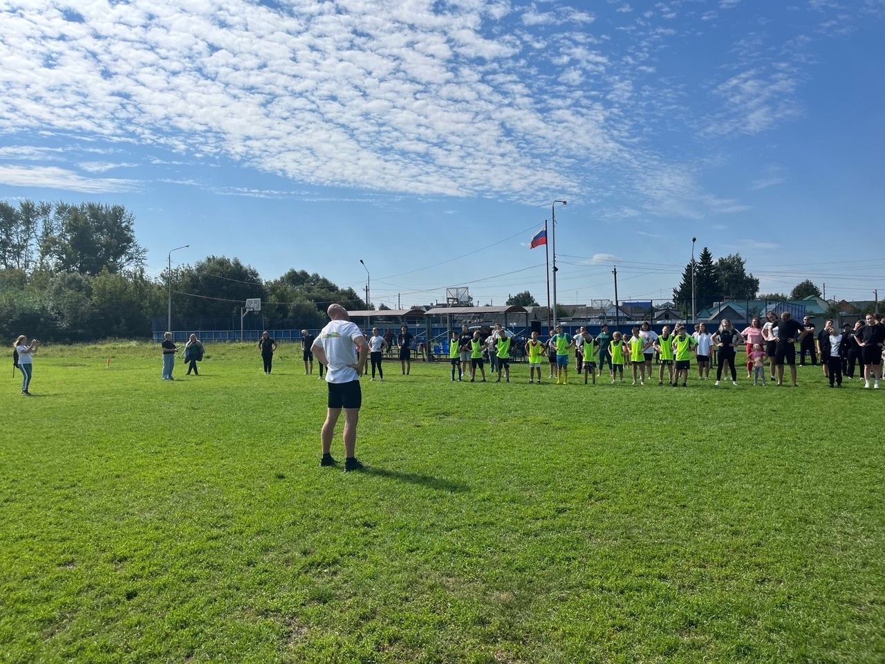 Программа праздника началась с зарядки с мастером спорта России, призёром Чемпионатов Мира и России, рекордсменом области в рывке гири, преподавателем детской юношеской спортивной школы Андреем Шендаковым.